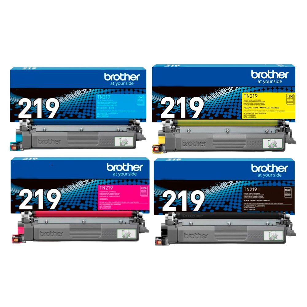 Kit de Toner Brother TN 219 incluye cartuchos originales de tóner negro cian magenta y amarillo capacidad de hasta 1.500 páginas para negro y 1.200 para colores impresión de alta calidad rendimiento superior fórmula avanzada de tóner compatible con impresoras Brother L3280Cdw, HL L3240Cdw, DCP L3560Cdw, MFC L3760Cdw fácil instalación.